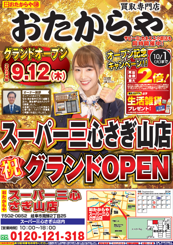 2024年9月12日(木)にスーパー三心さぎ山店OPENいたします! 2024-08-26 01:46:45 UTC 【新店舗のお知らせ】 2024年9月12日(木)にスーパー三心さぎ山店をOPENいたします。 住 所 :岐阜市南蝉2丁目25 スーパー三心さぎ山店内 フリーダイヤル:0120-121-318 営 業 時 間:10:00〜18:00 定 休 日 :水曜日 そ の 他 :駐車場完備 皆様のご来店をお待ちしております。